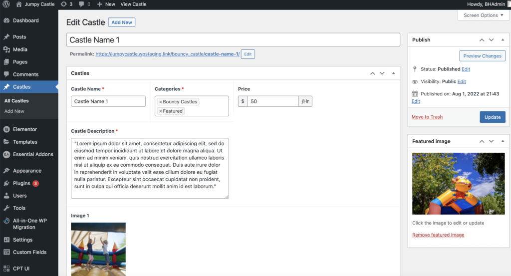 The theme uses advanced custom fields to easily added castles over time. Those pages act like a blog page without any need to use the Elementor editor to keep adding castles. Easily being able to add bounces makes managing the business online a breeze!