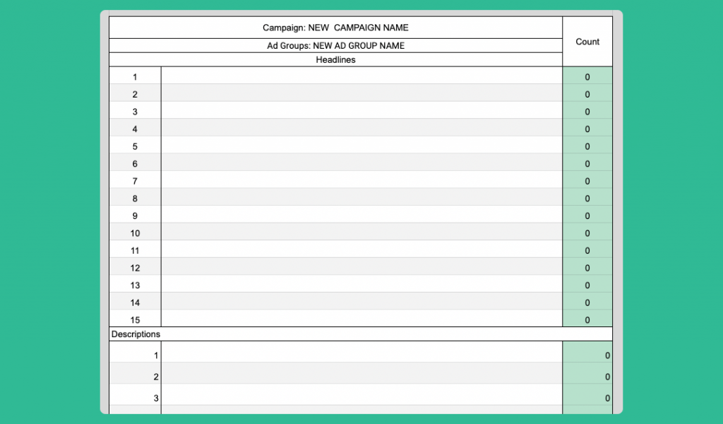 I have put together a Google Responsive Search Ads Template for you to write ads on a sheet and then present to clients. It has the space for 15 headlines, 4 descriptions, and the final URL.